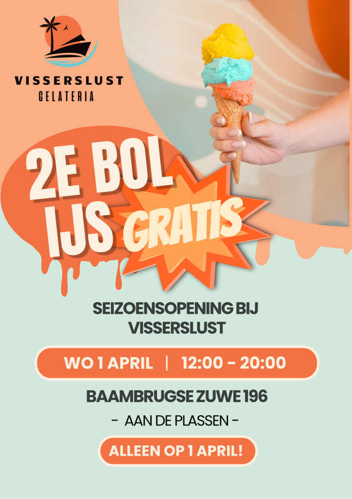 1 APRIL – SEIZOENSOPENING 🍦 We trappen het seizoen feestelijk af! Kom langs tussen 12:00 en 20:00 en ontvang je 2e bolletje ijs gratis. De perfecte start van het voorjaar aan de plassen ☀️