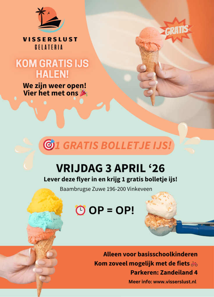 3 APRIL – GRATIS IJS VOOR KINDEREN 🎉 Vrijdag 3 april vieren we het begin van het seizoen extra feestelijk. Kinderen die in Vinkeveen op de basisschool zitten, krijgen een gratis bolletje ijs bij inlevering van de flyer.